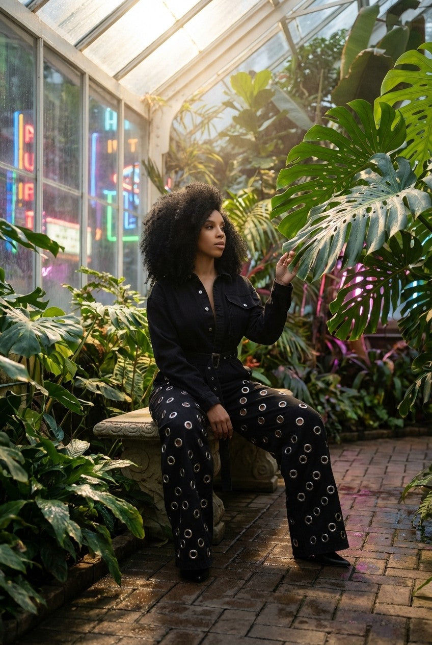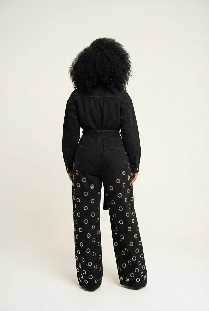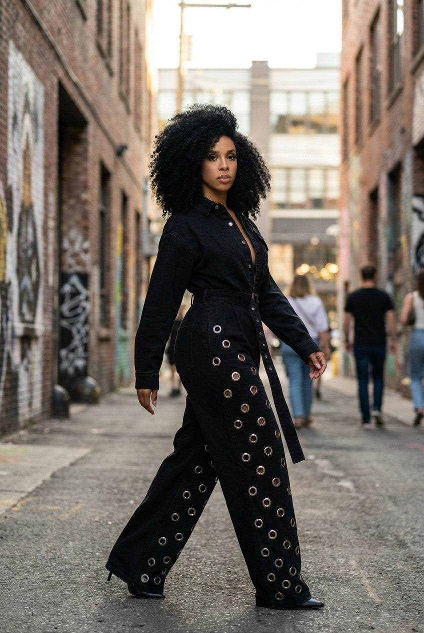 Bold and fashion-forward, this statement jumpsuit blends structured tailoring with eye-catching details for a standout look.