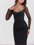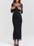 Elevate your style to new heights with our Black Backless Bodycon Suspender Maxi Dress. This dress is a stunning fusion of sophistication and sensuality, designed to make a statement wherever you go.