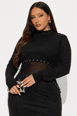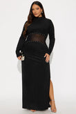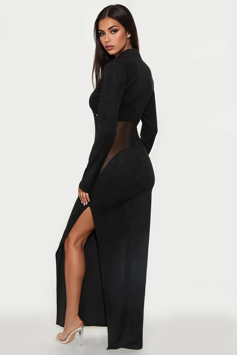 This black maxi dress features alluring mesh panels on the sides and is embellished with studs for an edgy, sexy look. The high neckline and long sleeves complement the lightweight mesh fabric, creating a refined and elegant look. The slim-fitting silhouette and high slit elongate the figure, making it ideal for evening events, parties, or special occasions. Pair it with simple heels and delicate jewelry to make this dress the centerpiece. Add a leather jacket for a casual and chic look.