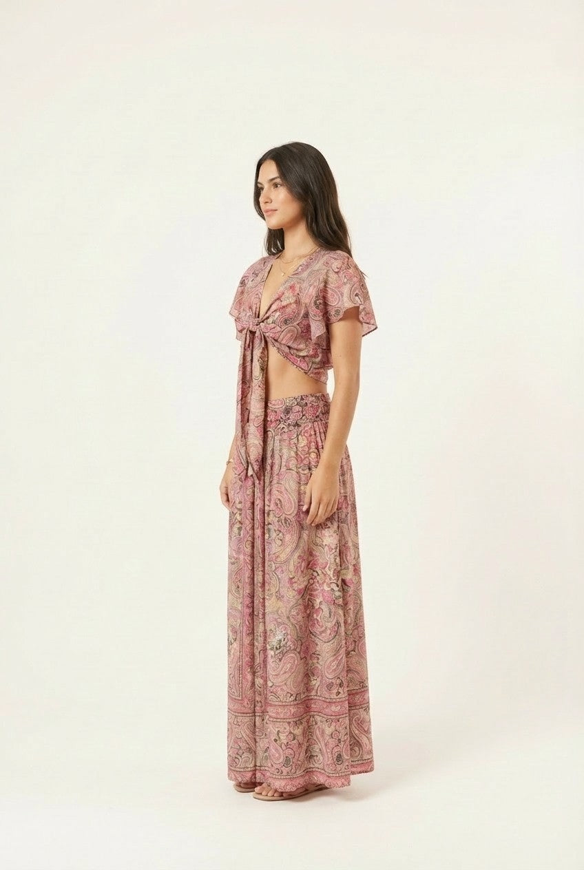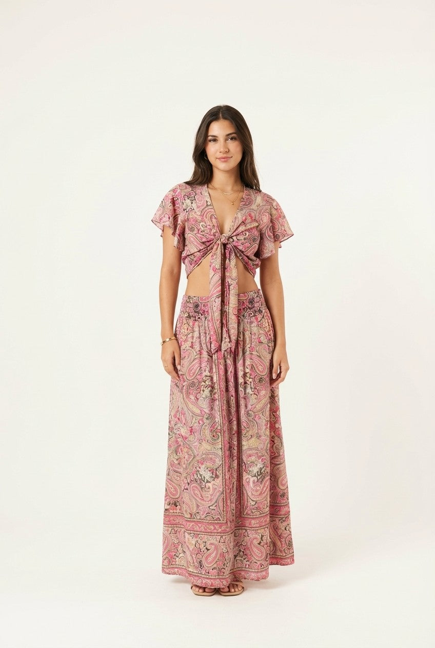 The Blossom Veil Three-Piece Set blends romantic prints with airy layers, creating a refined yet relaxed look perfect for sunlit escapes and evening strolls.