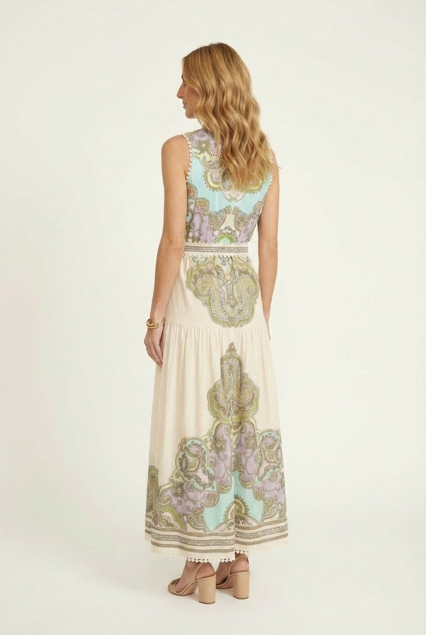 Elegant, airy, and effortlessly feminine—this sleeveless maxi dress features a soft paisley print with delicate detailing for a timeless bohemian look.