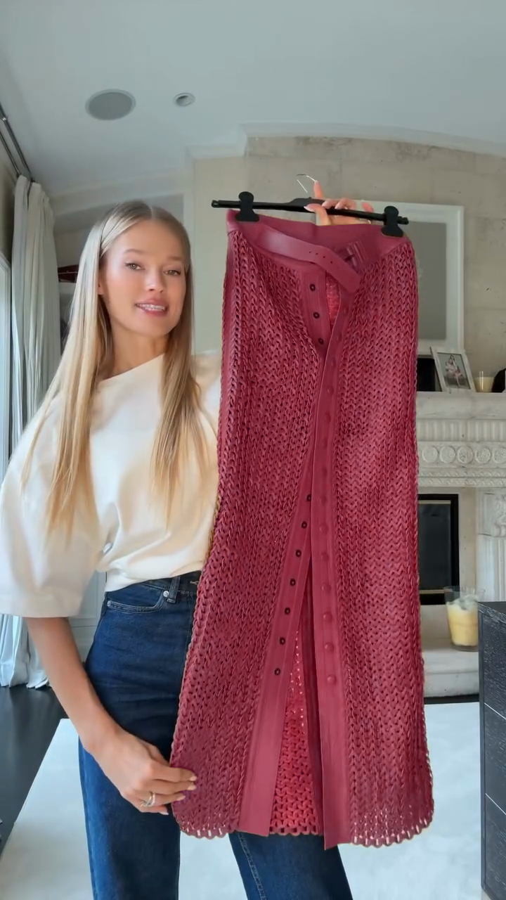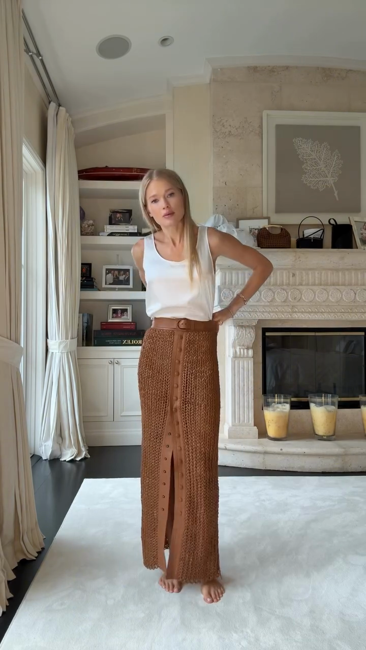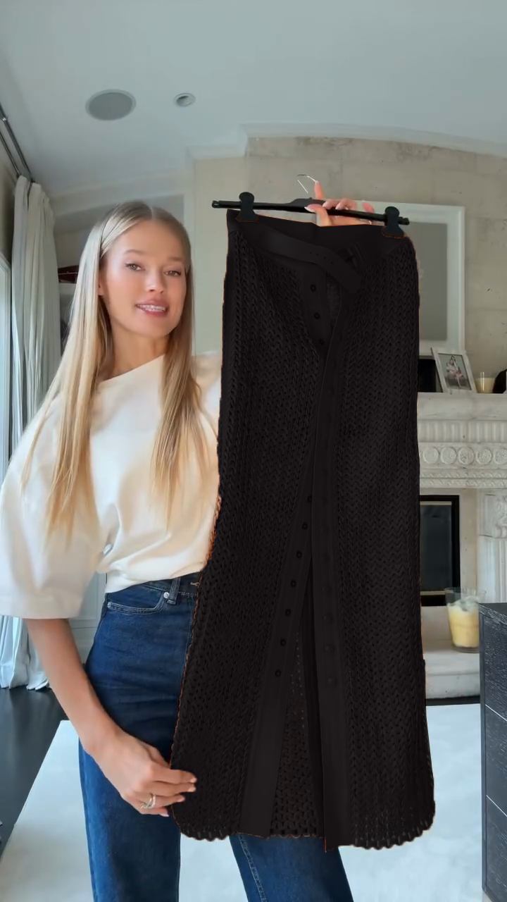 Elevate your wardrobe with this Brown Crochet Midi Skirt. The intricate crochet design, button - front detail, and leather trim create a stylish, textured look. Perfect for adding a bohemian - chic touch to your outfits. Pair with a simple tee and sandals for a casual vibe or dress it up with a blouse and heels.