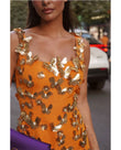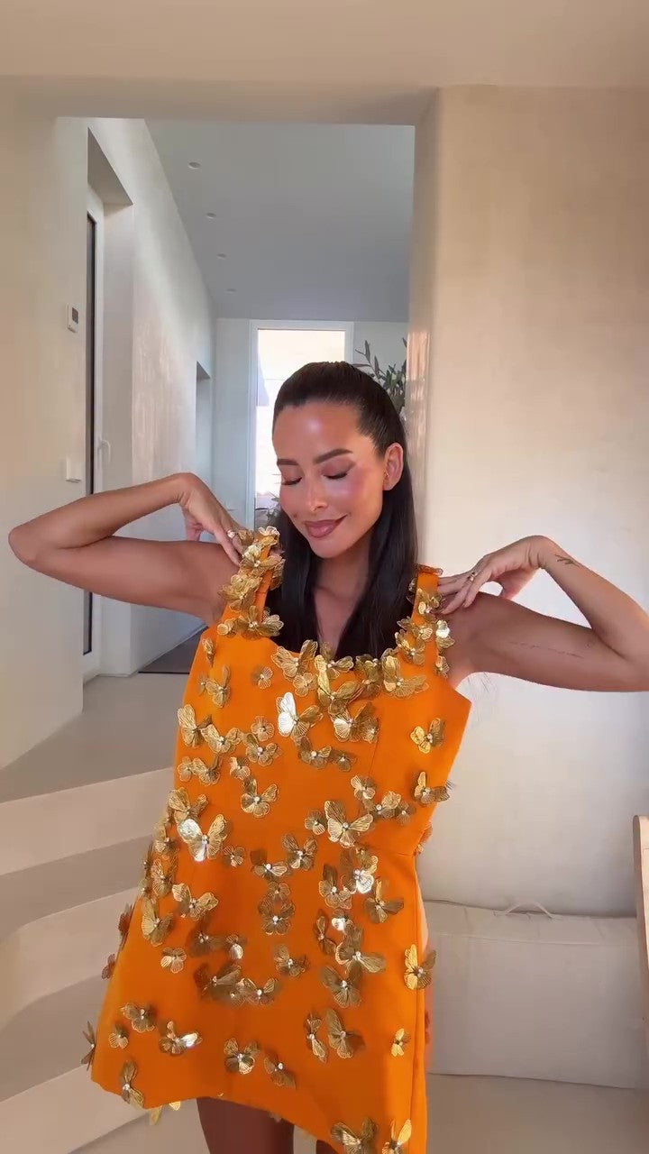 Three-dimensional butterflies embellish the dress, shimmering gracefully as you move. A perfect date night for a truly eye-catching look!