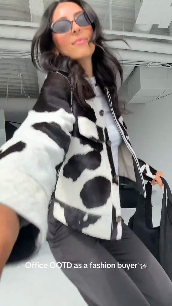 This outfit features a striking cow - print faux fur jacket with a cropped length and button - up front. It's worn over a light gray top and paired with high - waisted, wide - leg charcoal gray trousers. The person is also wearing sunglasses and holding a large black tote bag. The text "Office OOTD as a fashion buyer 🐄" suggests this is a stylish work - appropriate look for a fashion buyer. The background appears to be a modern, minimalist indoor space.