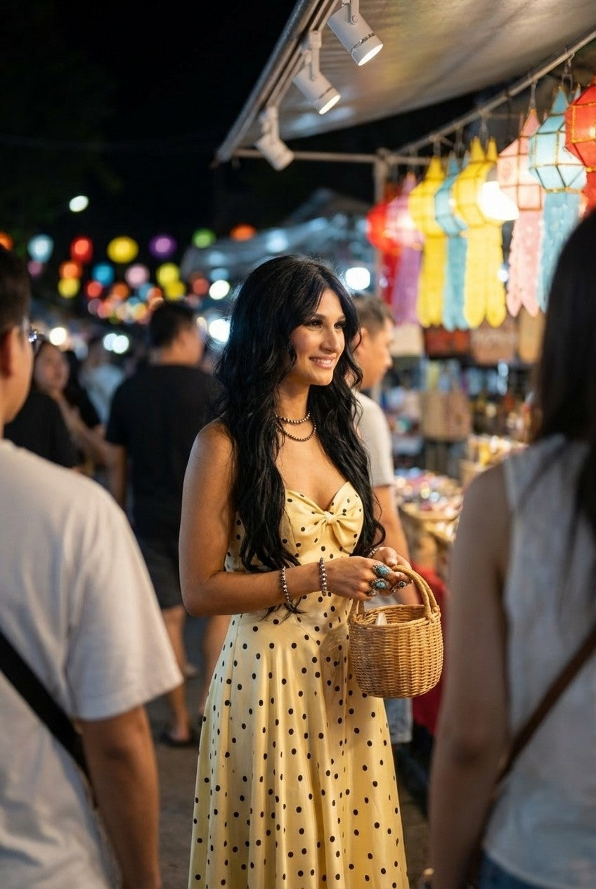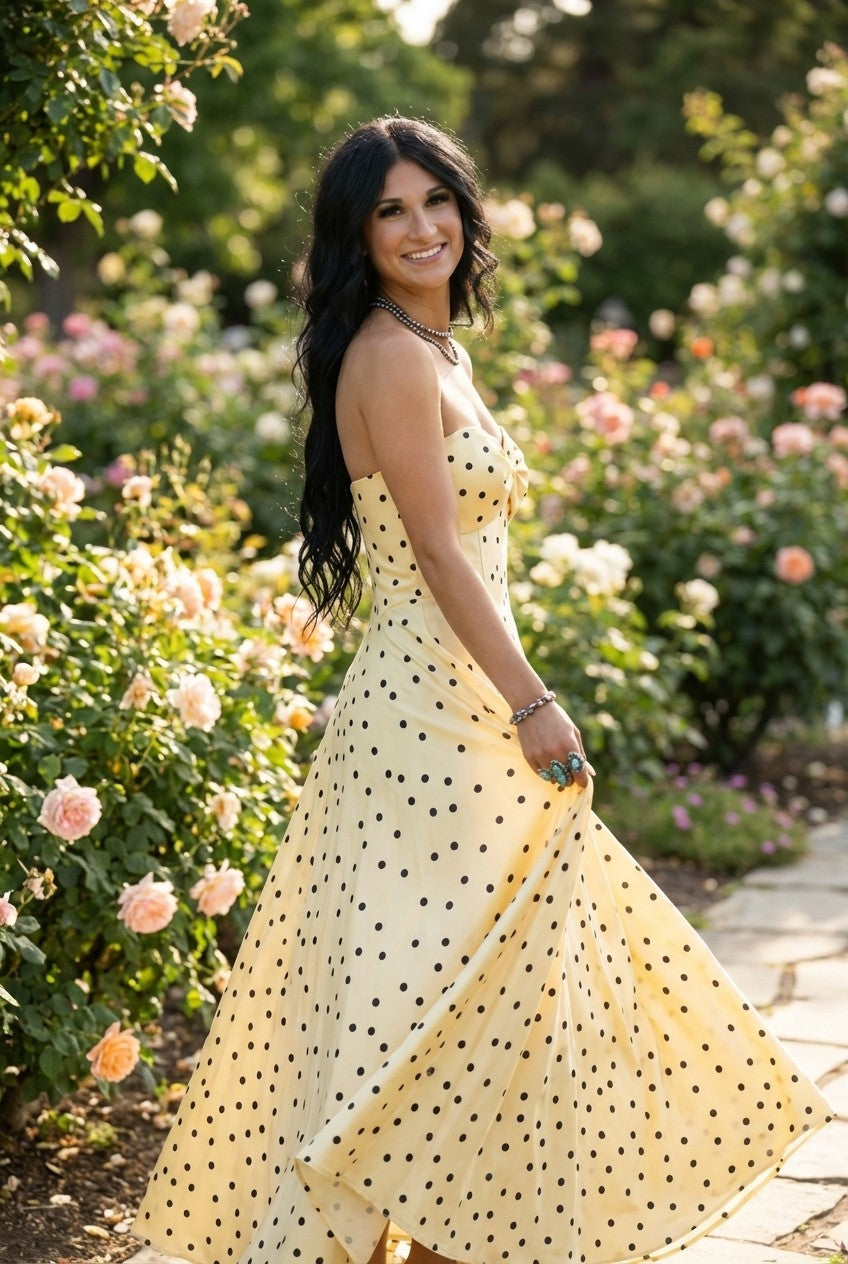 This polka dot maxi dress captures effortless femininity with its sculpted bodice and flowing skirt, designed to move beautifully with every step.