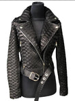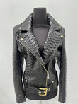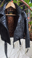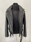 This jacket, crafted in a dark grey hue and featuring a striking crocodile-embossed pattern, exudes a luxurious yet edgy vibe. It features wide lapels and an adjustable belt for a comfortable fit. The belt is both practical and aesthetically pleasing, highlighting the waist.