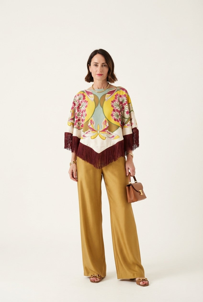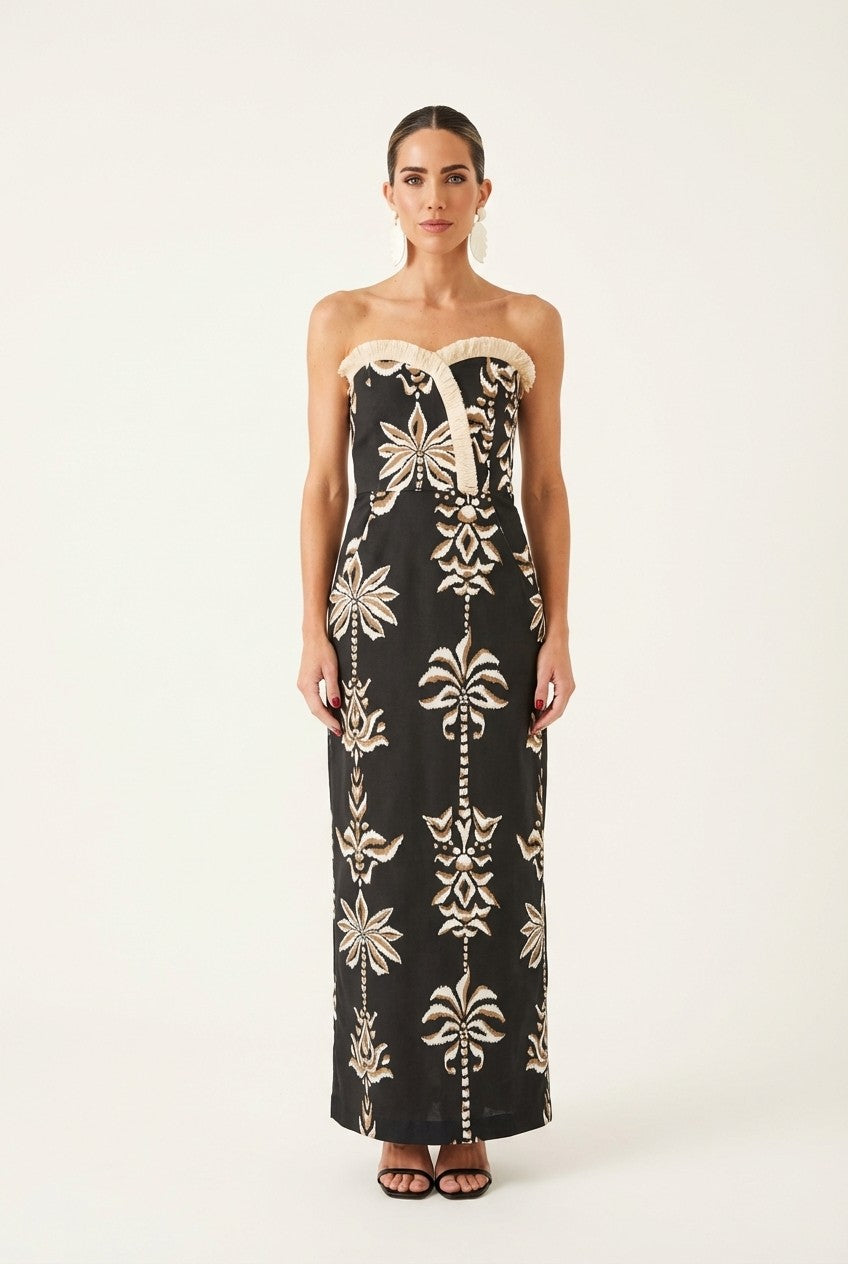 Light as air and effortlessly radiant, this flowing maxi dress captures sunlit elegance with its soft paisley print and delicate ruffle details—perfect for warm days that turn into golden evenings.