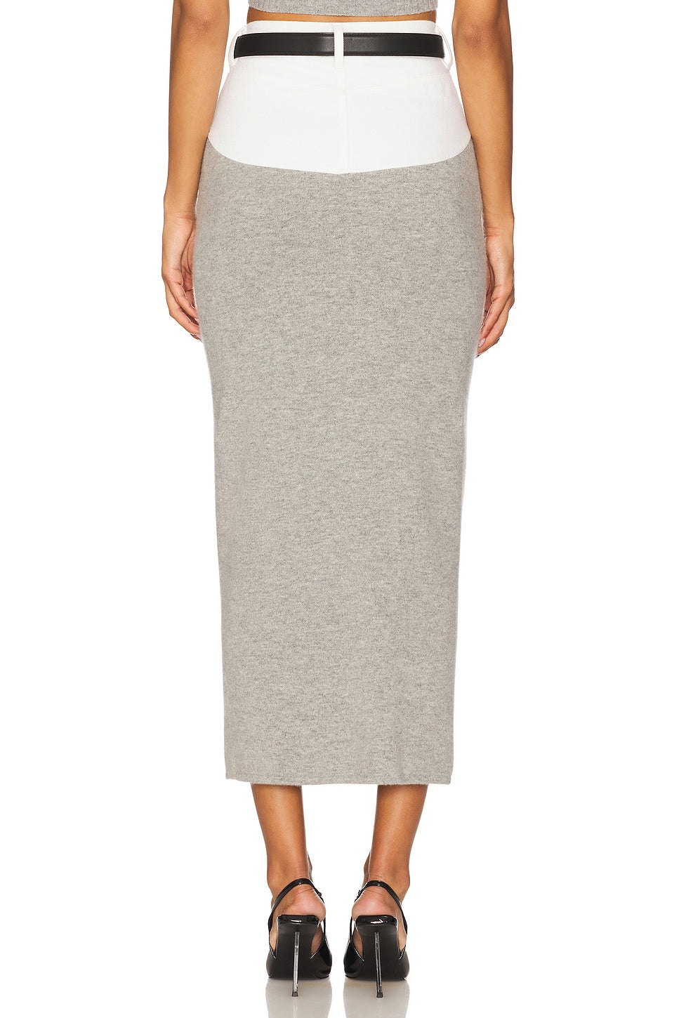 This gray suit is crafted from knit fabric and features short sleeves, a button-down collar, and contrasting white details. A black belt cinches the waist, framing the figure. White center paneling adds a playful touch.
