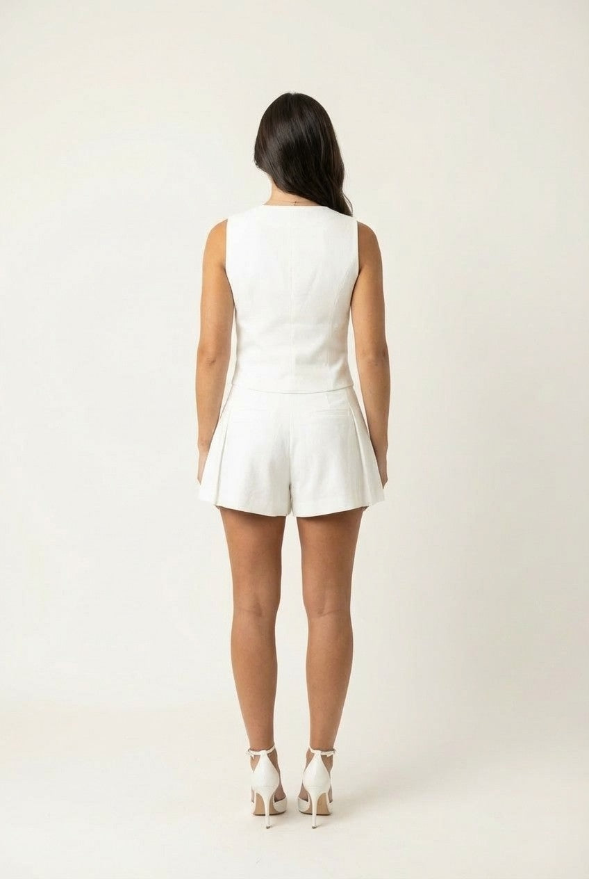 Sharp yet effortless, this tailored set brings a clean, modern edge to warm-weather dressing with a softly structured silhouette.
