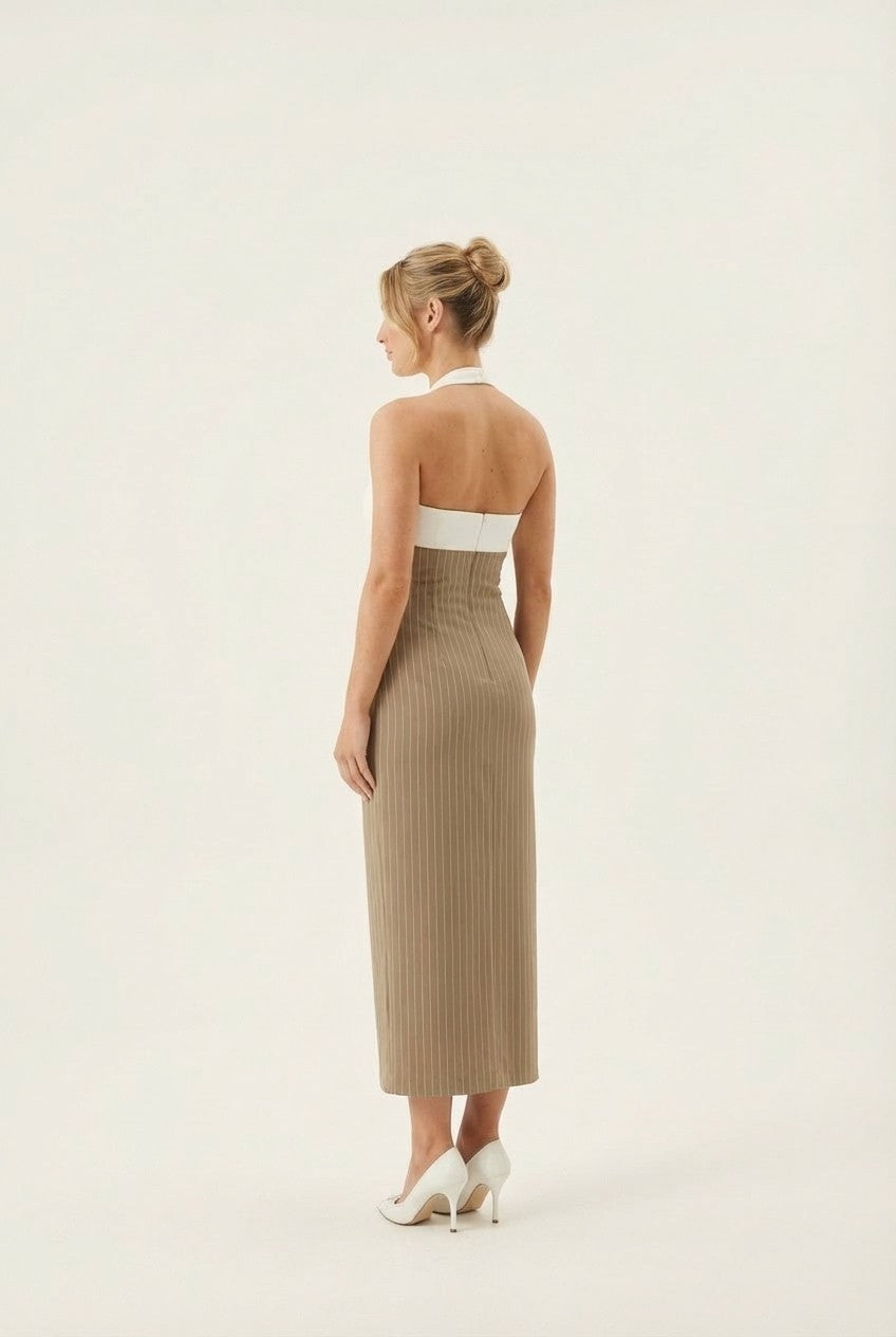 This minimalist midi dress combines clean lines with soft structure, creating an effortlessly elegant look that transitions seamlessly from day to evening.