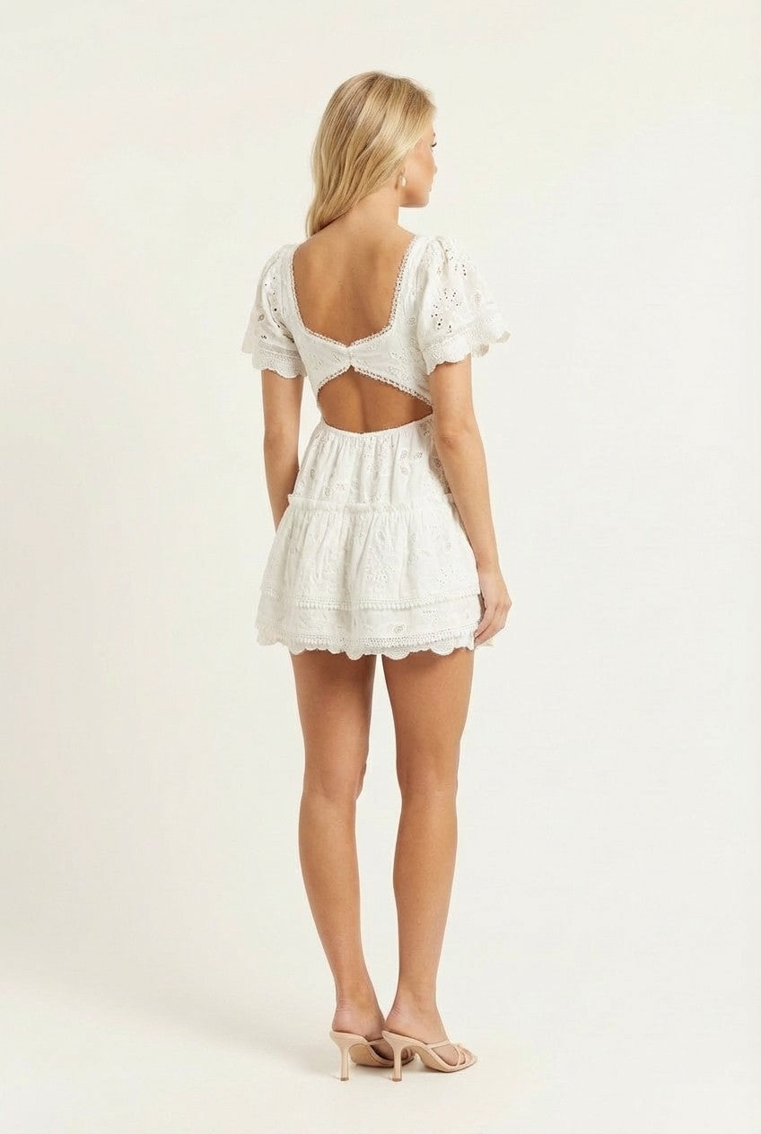The Lumière Lace Mini Dress captures the essence of summer with delicate textures and a flattering, feminine silhouette made for sunlit moments.