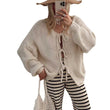 Outerwear: Loose-fitting cardigan with exaggerated sleeves, featuring a mixed-color knit pattern and a casual open front.