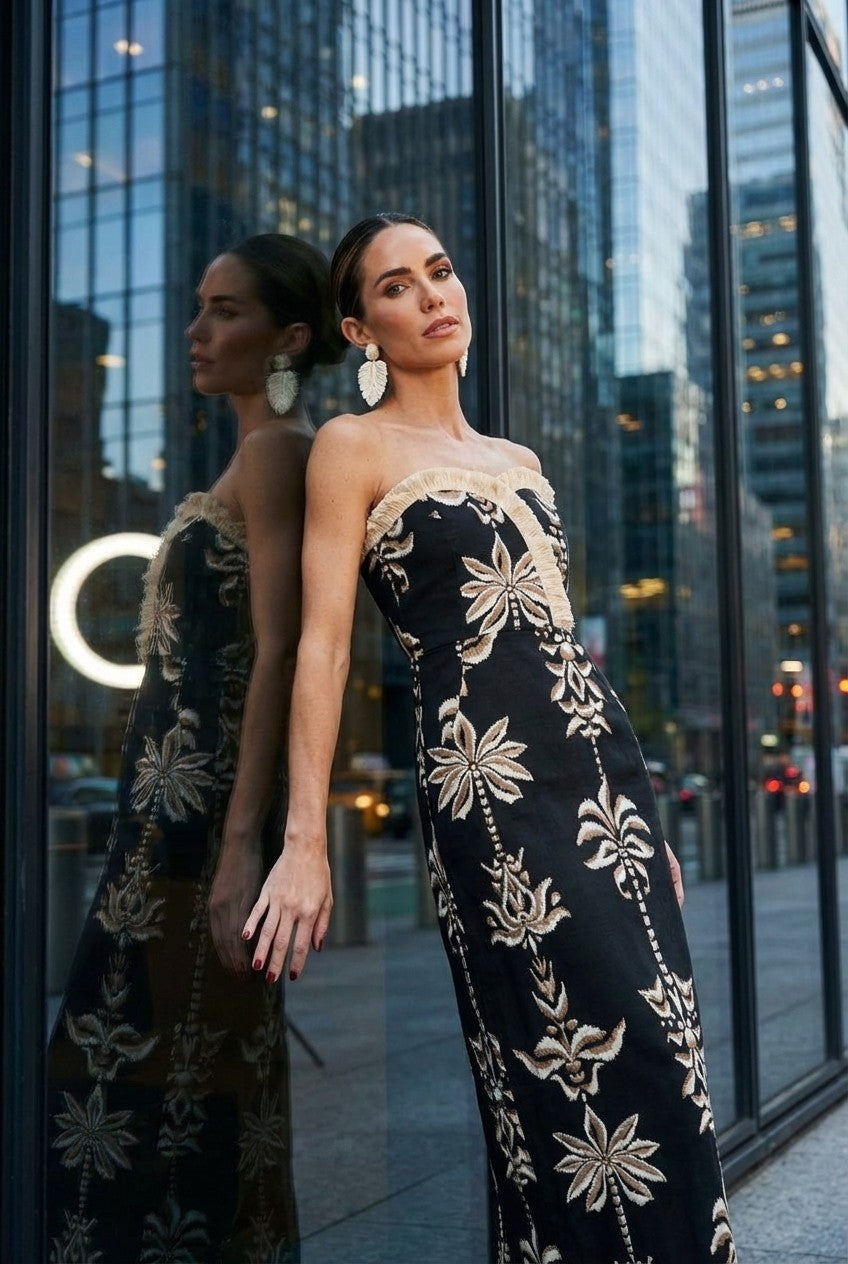 Striking, sculpted, and effortlessly refined—this strapless maxi dress blends bold print with timeless sophistication.