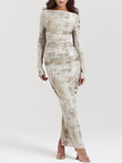 Crafted from a delicate pale sage fabric, this maxi dress features a stunning print that combines soft florals with intricate details. The combination of colors and patterns creates a harmonious and captivating look that's perfect for any special occasion.