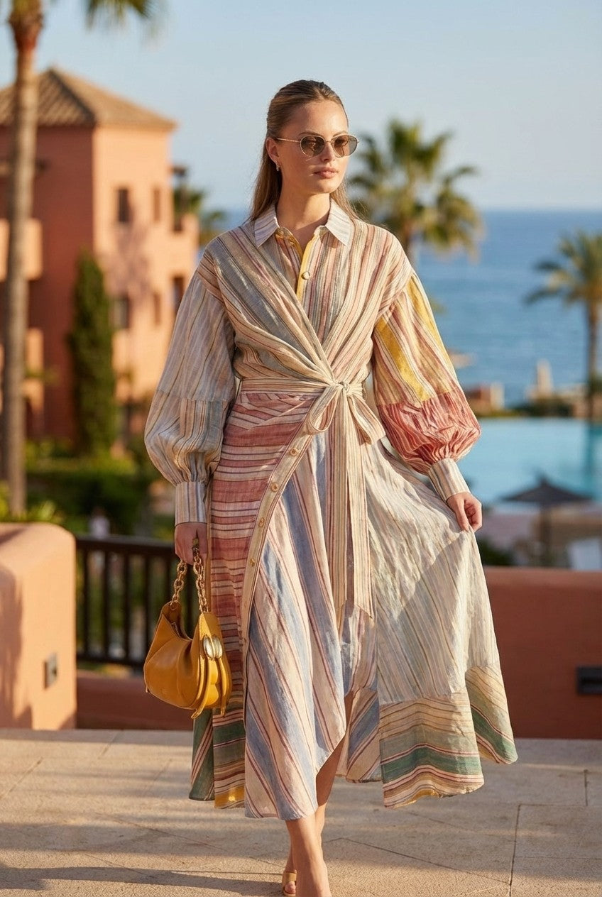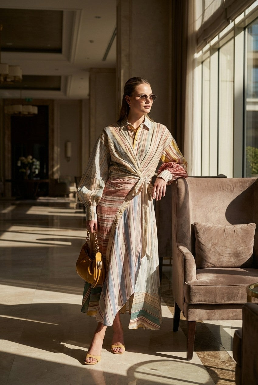 Effortlessly elegant with a modern twist, this dress features a flattering wrap-style waist and soft, flowing silhouette—perfect for both casual and elevated occasions.