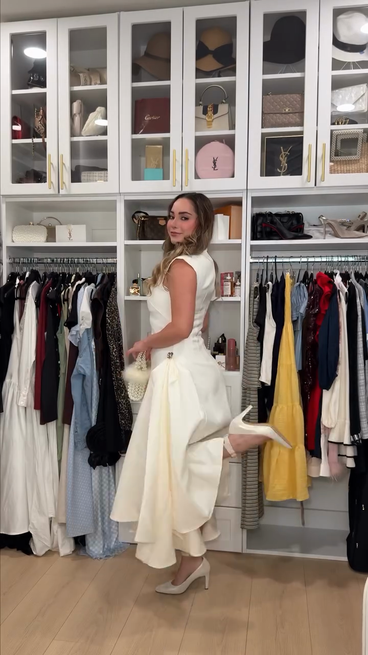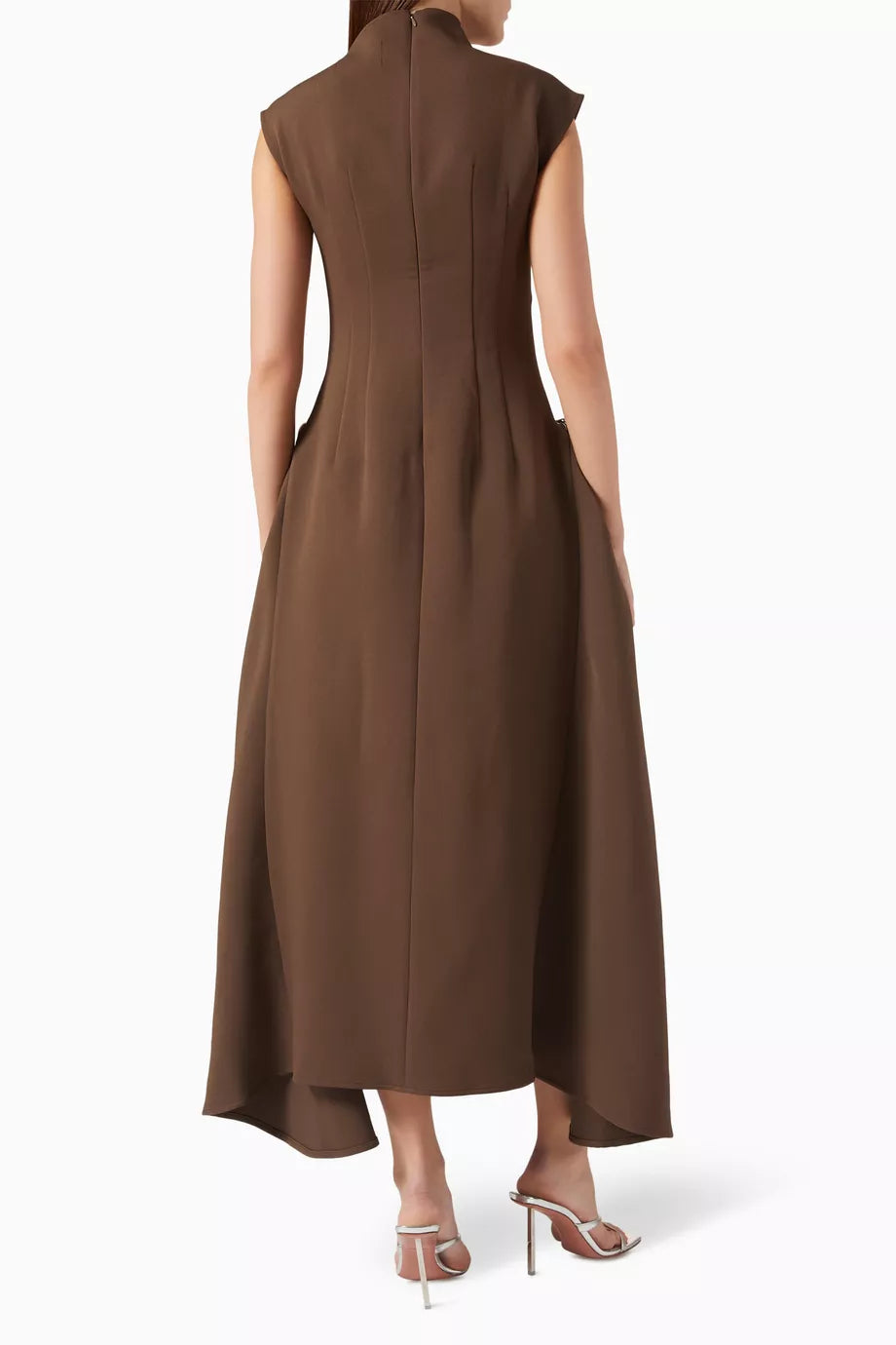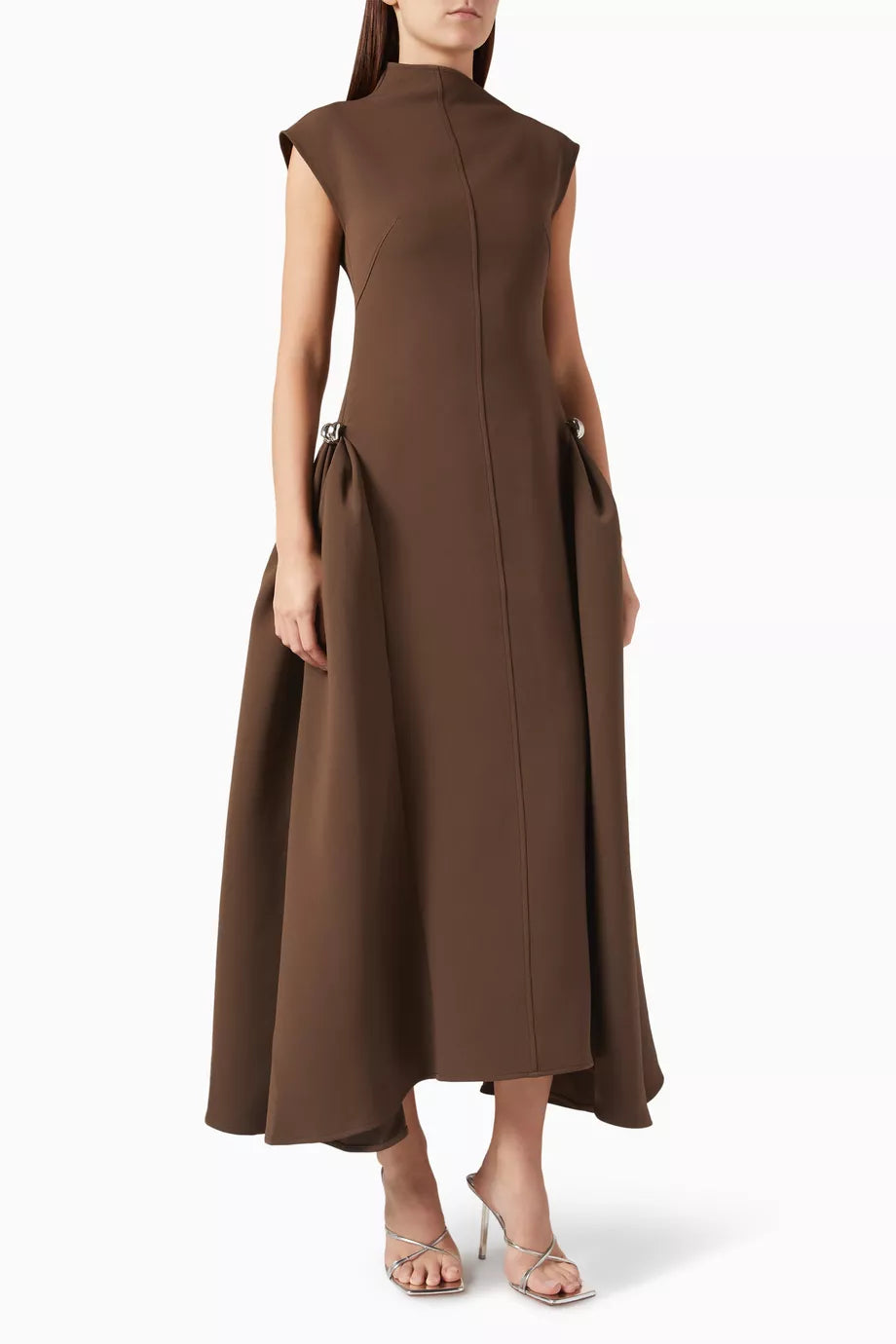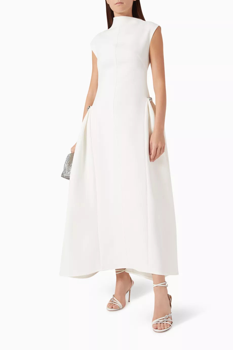 Design: White, high - neck, sleeveless, front zipper, flared maxi skirt, side decorative embellishments
