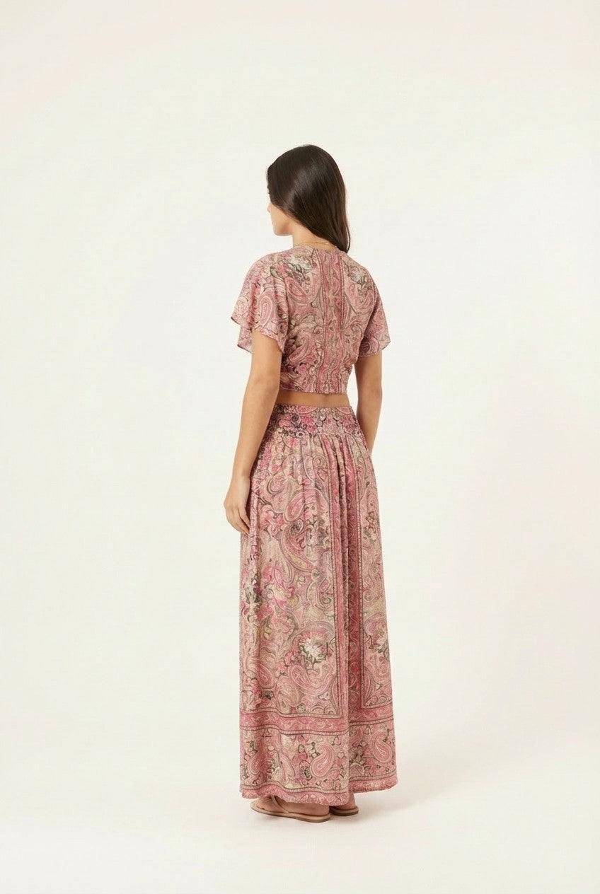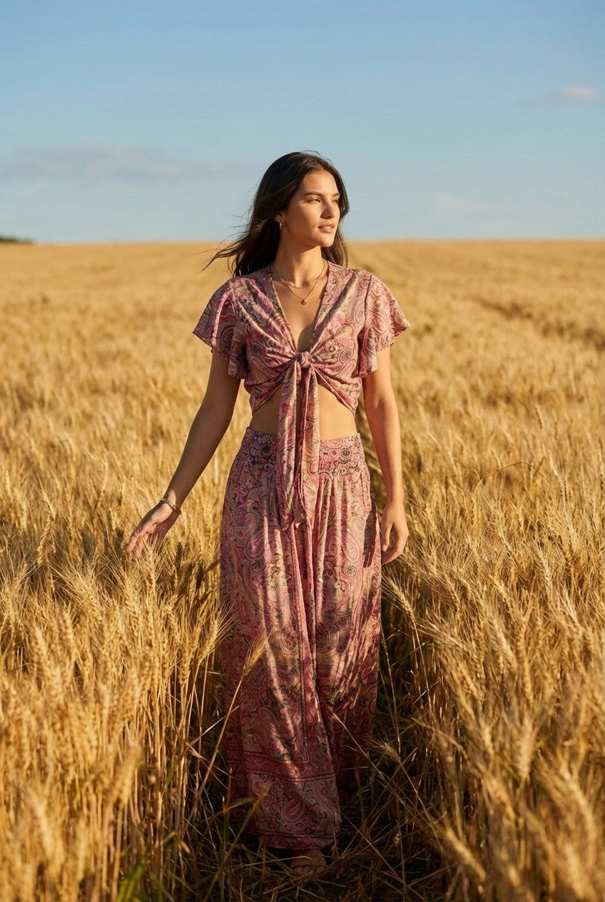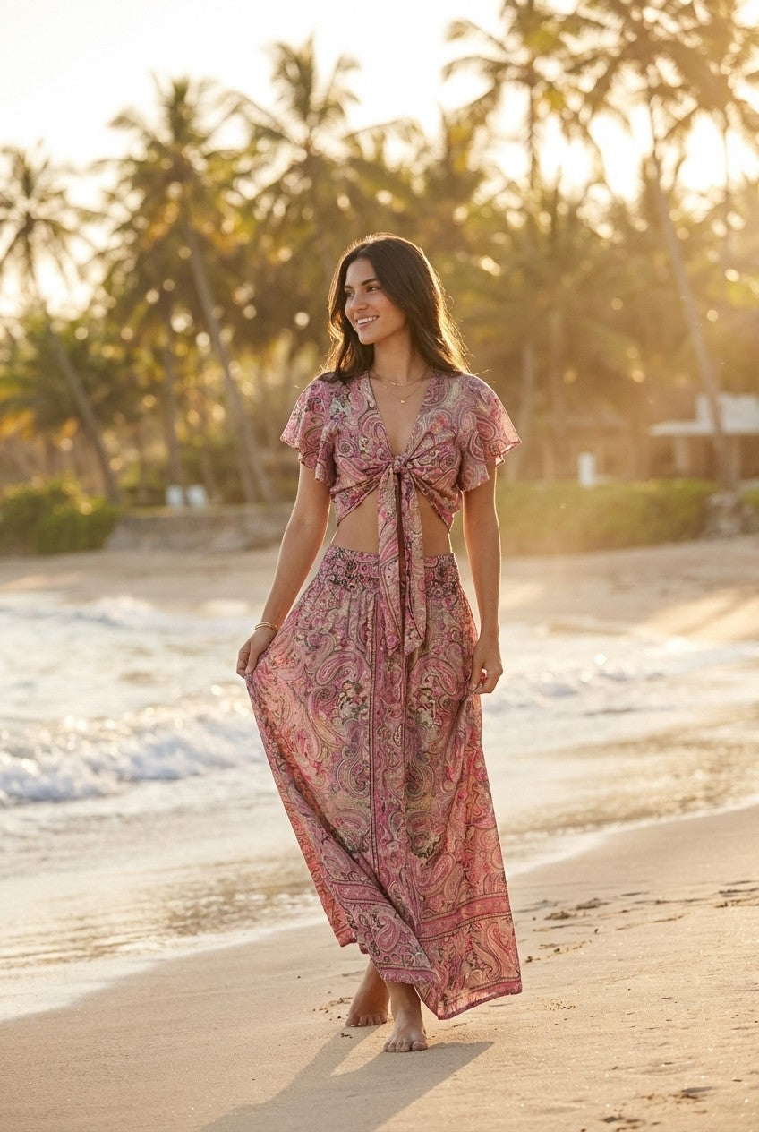 Embrace your inner wanderlust. This stunning two-piece set combines a vintage-inspired paisley print with a breezy, effortless silhouette designed for sun-drenched adventures and tropical getaways.
