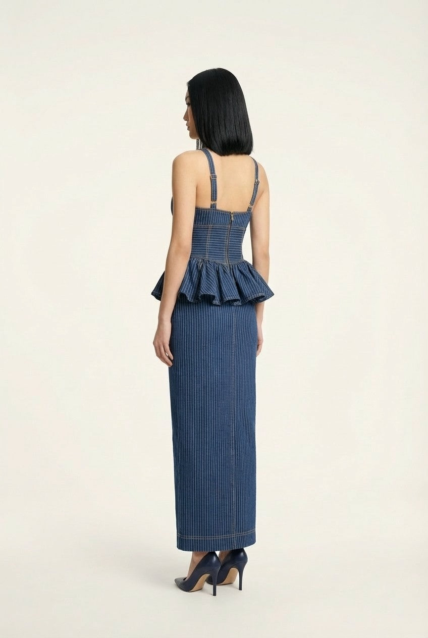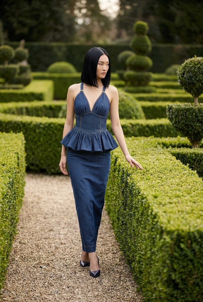 Structural sophistication meets denim charm. This architectural pinstripe dress redefines modern evening wear, blending a dramatic silhouette with the timeless appeal of classic denim for a truly standout look.