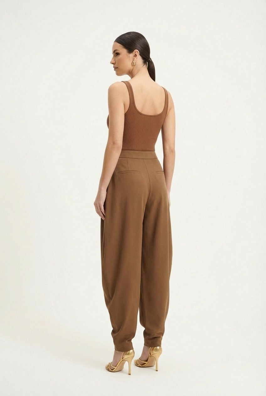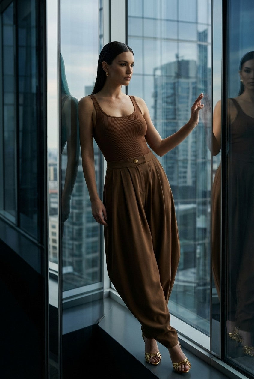 Sophisticated coordination defined. This matching set blends a sleek, ribbed tank with avant-garde pleated trousers for a look that is both architectural and effortless. Designed for the woman who appreciates bold silhouettes and tonal perfection.